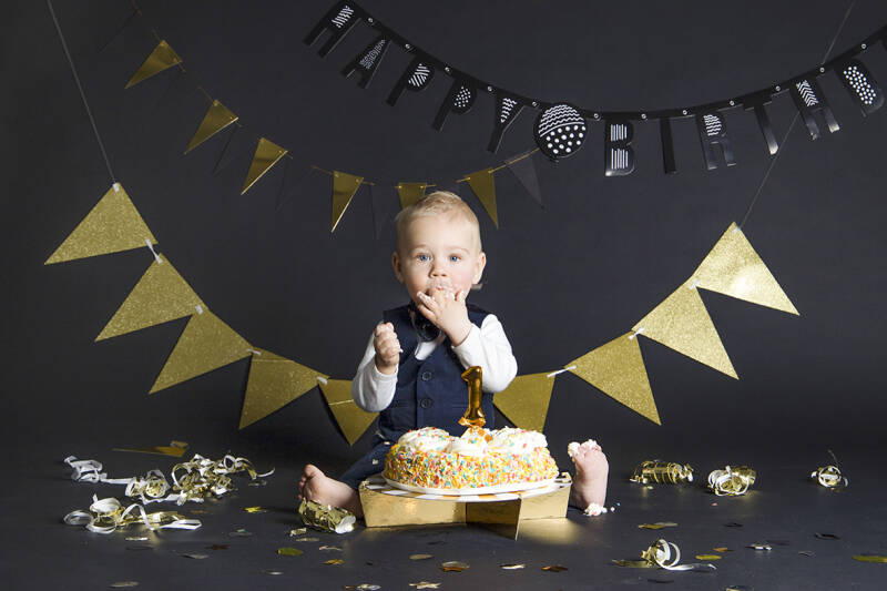 - Ik maak eerst foto's van je kindje zonder taart. De aankleding is er dan al wel, maar ik kan afwisselend beeld schieten. Van je kindje die met een ballon speelt, in een houten kistje zit, of gewoon met grote ogen om zich heen kijkt, bijvoorbeeld. Dit zorgt voor een leuke aanvulling op de foto's met de taart.